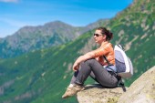 kobieta siedzi na skale w górach z plecakiem, zrelaksować się w pięknej scenerii
