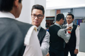 Dojrzałe Azjatki przedsiębiorca zawsze zajęty odwiedzając krawiec i rozmowy na telefon
