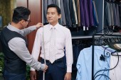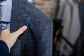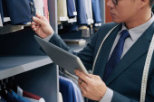 Krawiec, sprawdzanie wszystkie szczegóły nowej kurtki