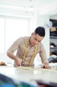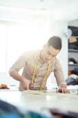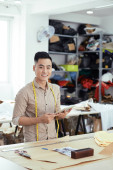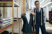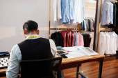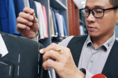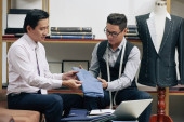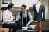 Wietnamski męskiej projektanci mody, omawianie materiału do nowej kolekcji