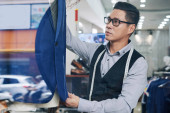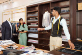 Wietnamski uśmiechający się dostosować, oferując różne tkaniny dla klienta