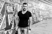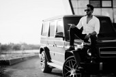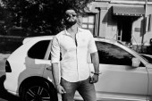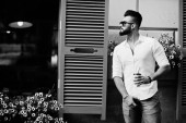 Stylowe, wysoki mężczyzna arabian modelu w białej koszuli, dżinsy i okulary stwarzane przy ulicy miasta. Broda atrakcyjnym facetem arab.