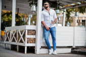 Stylowe, wysoki mężczyzna arabian modelu w białej koszuli, dżinsy i okulary stwarzane przy ulicy miasta. Broda atrakcyjnym facetem arab.