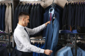 Dojrzały człowiek wietnamski, wybierając nowy komplet w sklepie