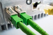 pracuje 24 portowy przełącznik w którym włożona jest żółty kabel, 19 port, przełącznik jest dostawcą intranetowych dostępu do sieci
