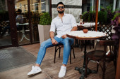 Stylowy, wysoki mężczyzna arabian modelu w białej koszuli, dżinsy i okulary spaceru na ulicy miasta. Broda atrakcyjnym facetem arab.