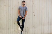 Stylowe, wysoki mężczyzna arabian modelu w białej koszuli, dżinsy i okulary stwarzane przy ulicy miasta. Broda atrakcyjnym facetem arab.