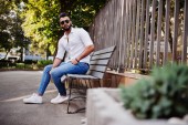 Stylowe, wysoki mężczyzna arabian modelu w białej koszuli, dżinsy i okulary stwarzane przy ulicy miasta. Broda atrakcyjnym facetem arab ogląda czerwony telefon.