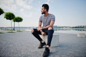 Stylowy, wysoki mężczyzna arabian modelu w białej koszuli, dżinsy i okulary przeciwsłoneczne, siedząc przy ulicy miasta. Broda atrakcyjnym facetem arab filiżankę kawy w parku.