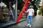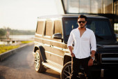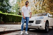 Stylowe, wysoki mężczyzna arabian modelu w białej koszuli, dżinsy i okulary stwarzane przy ulicy miasta. Broda bogaty atrakcyjnym facetem arab przeciwko suv biały samochód.