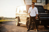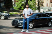 Stylowe, wysoki mężczyzna arabian modelu w białej koszuli, dżinsy i okulary stwarzane przy ulicy miasta. Broda bogaty atrakcyjnym facetem arab przeciwko suv biały samochód.