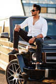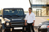 Stylowe, wysoki mężczyzna arabian modelu w białej koszuli, dżinsy i okulary stwarzane przy ulicy miasta. Broda bogaty atrakcyjnym facetem arab przeciwko suv biały samochód.