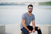 Stylowe, wysoki mężczyzna arabian modelu w białej koszuli, dżinsy i okulary stwarzane przy ulicy miasta. Broda bogaty atrakcyjnym facetem arab przeciwko suv biały samochód.