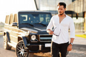 Stylowe, wysoki mężczyzna arabian modelu w białej koszuli, dżinsy i okulary stwarzane przy ulicy miasta. Broda bogaty atrakcyjnym facetem arab przeciwko suv biały samochód, mówiąc na telefon komórkowy.