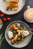 Świeży bun serwowane z boczkiem, jajka Benedykta pod sosem na drewniana deska do krojenia