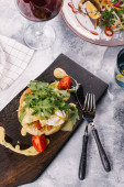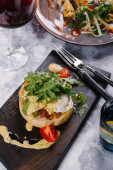 Świeży bun serwowane z boczkiem, jajka Benedykta pod sosem na drewniana deska do krojenia