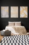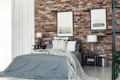 Zdjęcie "Roślin obok łóżka w szary sypialnia wnętrza żyrandol, czarny plakat i zegar. Prawdziwe zdjęcie" może być wykorzystywane do celów osobistych i komercyjnych zgodnie z warunkami zakupionej licencji Royalty-free. Obraz jest dostępny do pobrania w jakości wysokiej rozdzielczości do 5760x3840.