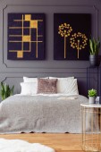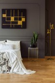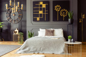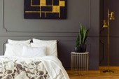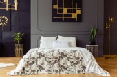 Roślin obok łóżka w szary sypialnia wnętrza żyrandol, czarny plakat i zegar. Prawdziwe zdjęcie
