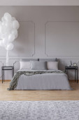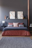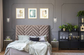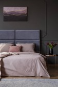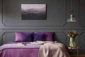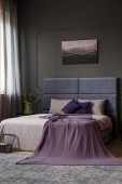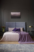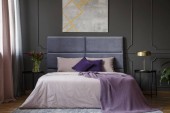 Prawdziwe zdjęcie wnętrza elegancki apartament dla dwóch osób z fioletowy, duże łóżko i nowoczesny obraz na ścianie