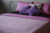 Zdjęcie "Prawdziwe zdjęcie wnętrza elegancki apartament dla dwóch osób z fioletowy, duże łóżko i nowoczesny obraz na ścianie" może być wykorzystywane do celów osobistych i komercyjnych zgodnie z warunkami zakupionej licencji Royalty-free. Obraz jest dostępny do pobrania w jakości wysokiej rozdzielczości do 5760x3840.