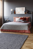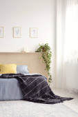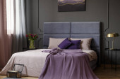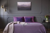 Różowy Kocyk na łóżko z zagłówkiem ścianę szarego z plakatu w sypialni eleganckie wnętrza