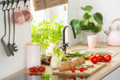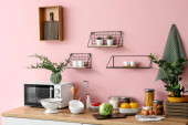 Zdjęcie "Prawdziwe zdjęcie kuchnia wnętrz z pastelowy różowy kubki i miseczki na półki, świeże rośliny oraz domowej roboty ciasto biszkoptowe na blacie" może być wykorzystywane do celów osobistych i komercyjnych zgodnie z warunkami zakupionej licencji Royalty-free. Obraz jest dostępny do pobrania w jakości wysokiej rozdzielczości do 5760x3840.