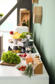 Nowoczesne meble z przyborami kuchennymi i produktów wewnątrz