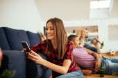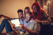 Przyjaciele oglądania filmu na cyfrowej tablet w domu.