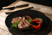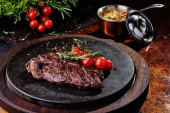 Wyśmienity stek w sosie Teriyaki z grillowanymi pomidorami cherry, czerwoną kapustą i liści szpinaku, kukurydza dziecka i kumkwat