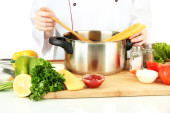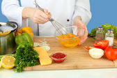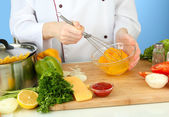 ręce przygotowanie cebuli na patelni, na niebieskim tle