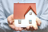 Człowiek posiadający modelu Dom na szarym tle. Koncepcja kredyt hipoteczny