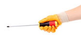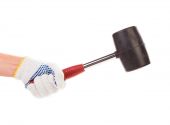 Szczelnie-do góry ręką w rękawicy trzyma zestaw młot. Jest izolowany w tle.