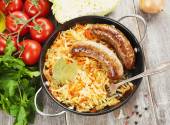 Płyta z kapustą pyszne i kiełbaski z grilla na drewnianym stole