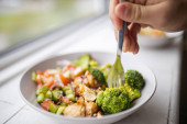 Kobieta w domu jedzenie sałatka smaczny kurczak zbliżenie