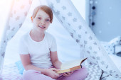 Ładny mały dziewczyna czytania książki w rudery w domu