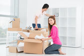 Kochający rodziny azjatyckie wypakowywania rzeczy o nowe mieszkanie, stosy pudełek ruchomych