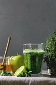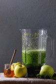 Matcha zielonej herbaty iced latte lub koktajl w trzy różne szklanki z kostkami lodu, proszek matcha i Dzbanek mleka na białego marmuru tabeli, ozdobiona zielonymi gałązkami. Szara ściana w tle