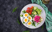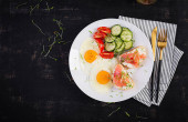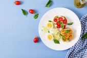 Zdjęcie "Cząber gofry z szpinakiem i jajko, pomidor, łosoś w białej płytce. Smaczne jedzenie. Widok z góry. Leżał z płaskim" może być wykorzystywane do celów osobistych i komercyjnych zgodnie z warunkami zakupionej licencji Royalty-free. Obraz jest dostępny do pobrania w jakości wysokiej rozdzielczości do 5760x3840.