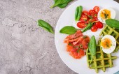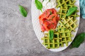 Cząber gofry z szpinakiem i jajko, pomidor, łosoś w białej płytce. Smaczne jedzenie. Widok z góry. Leżał z płaskim