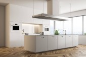 Wnętrze nowoczesna kuchnia z białe ściany, drewniana podłoga, duże okna i biała wyspa z zabudowy AGD. makiety 3D renderowania