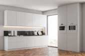 Zdjęcie "Wnętrze nowoczesna kuchnia z białe ściany, drewniana podłoga, duże okna i biała wyspa z zabudowy AGD. makiety 3D renderowania" może być wykorzystywane do celów osobistych i komercyjnych zgodnie z warunkami zakupionej licencji Royalty-free. Obraz jest dostępny do pobrania w jakości wysokiej rozdzielczości do 5760x3840.