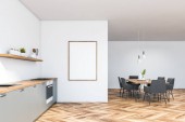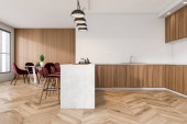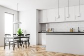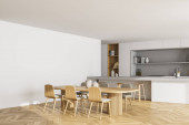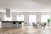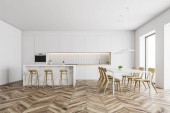 Wnętrze nowoczesne jadalnia i kuchnia z białe ściany, drewniane podłogi, białe blaty, drewniany bar Stołki i stół z krzesłami. przestrzeni kopii renderowania 3D