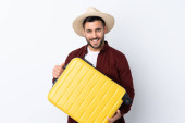 Młody człowiek z walizką na kolor tła. Miejsca na tekst