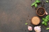 Zdjęcie "Rama żywności. Tło żywności - przyprawy: pieprz, czosnek, bazylia. Składniki marynaty." może być wykorzystywane do celów osobistych i komercyjnych zgodnie z warunkami zakupionej licencji Royalty-free. Obraz jest dostępny do pobrania w jakości wysokiej rozdzielczości do 5760x3840.