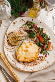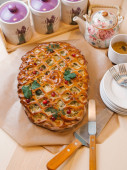 z liści jesienią na kamienne podłoże serwowane świeże quiche z grzybami