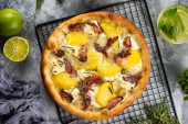 z liści jesienią na kamienne podłoże serwowane świeże quiche z grzybami