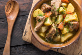 Zdjęcie "Gulasz z mięsa z ziemniakami i marchewką. Zupa gulaszowa. Widok z góry. Miejsce." może być wykorzystywane do celów osobistych i komercyjnych zgodnie z warunkami zakupionej licencji Royalty-free. Obraz jest dostępny do pobrania w jakości wysokiej rozdzielczości do 5760x3840.