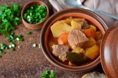 Gulasz z mięsa z ziemniakami i marchewką. Zupa gulaszowa. Widok z góry. Miejsce.