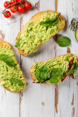 Zdrowe śniadanie z tosty z chleba i rozbite awokado na desce