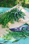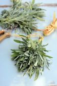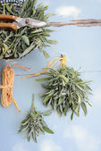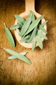 Miska z suszonej szałwii i świeże mędrzec nad podłoże drewniane